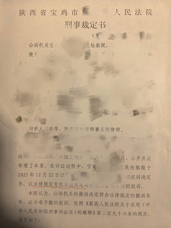 近日,由陕西行中律师事务所资深律师、闫存厚教授担任辩护人的杨某某涉嫌贩卖毒品罪一案,经过三次庭审后宝鸡市某区人民检察院以法律规定变化为由撤回起诉,宝鸡市某区人民法院依法裁定准许撤诉。这场历时近两年的刑事辩护案件以当事人获撤案结果圆满落幕,闫存厚律师的专业辩护也再次彰显了刑事辩护中精准适用法律、维护当事人合法权益的重要价值。