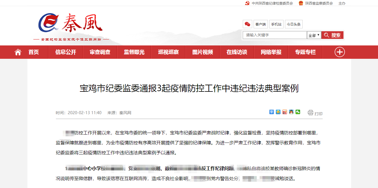 事例二:2月13日《秦风网》报道,宝鸡市某县中心小学校长蔡某某、党支部书记张某、政教副主任张某违反工作纪律问题。政教副主任张某私自将该校某教师确诊新型冠状病毒感染肺炎的情况说明传至微信群,导致该信息在互联网流传,造成不良社会影响。宝鸡市纪监委对政教副主任张某党内警告处分,校长蔡某某、党支部书记张某被诫勉谈话。