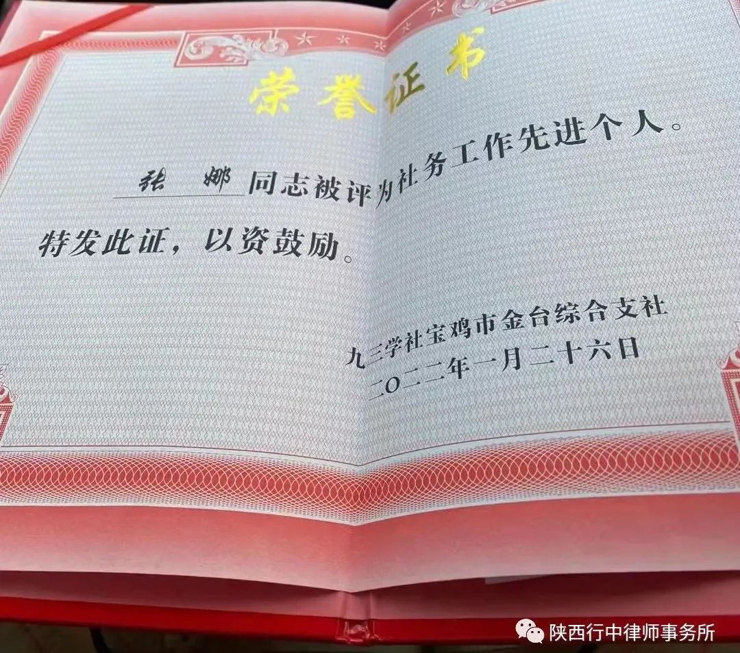3月4日,九三学社宝鸡市金台综合支社召开2022年工作会。会上,陕西行中律师事务所张娜律师被表彰为2021年度“社务工作先进个人”。