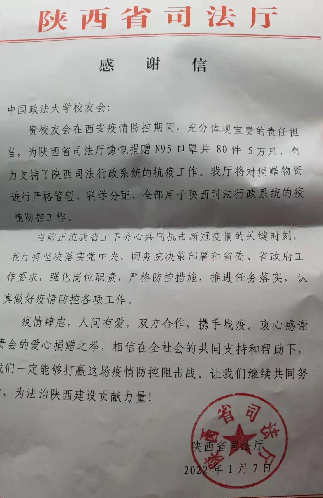 疫情无情人有情,中国政法大学陕西校友会不仅积极向宝鸡市渭滨区捐赠物资,在2021年12月西安疫情严重时也积极开展捐赠活动,通过陕西省司法厅向西安市捐赠了大量抗疫物资。