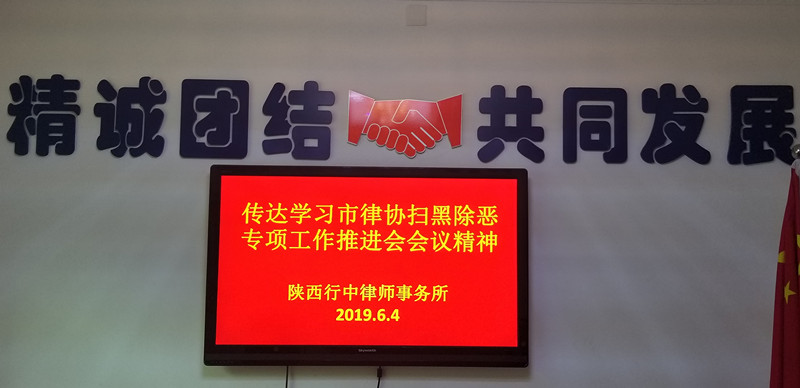 6月4日上午,陕西行中律师事务所组织全体人员认真传达学习了宝鸡市律师协会扫黑除恶专项工作推进会会议精神。