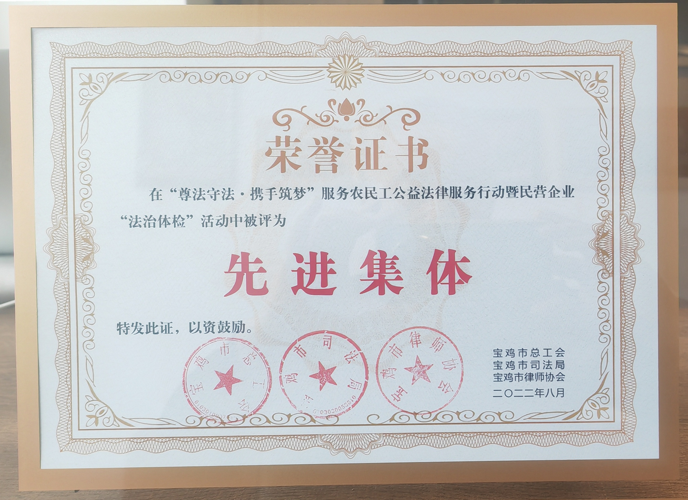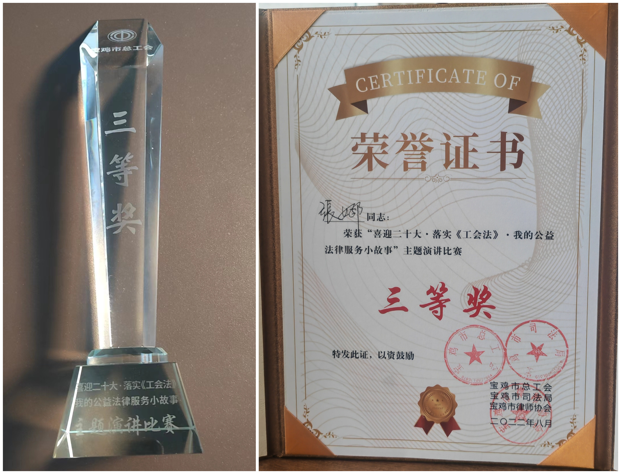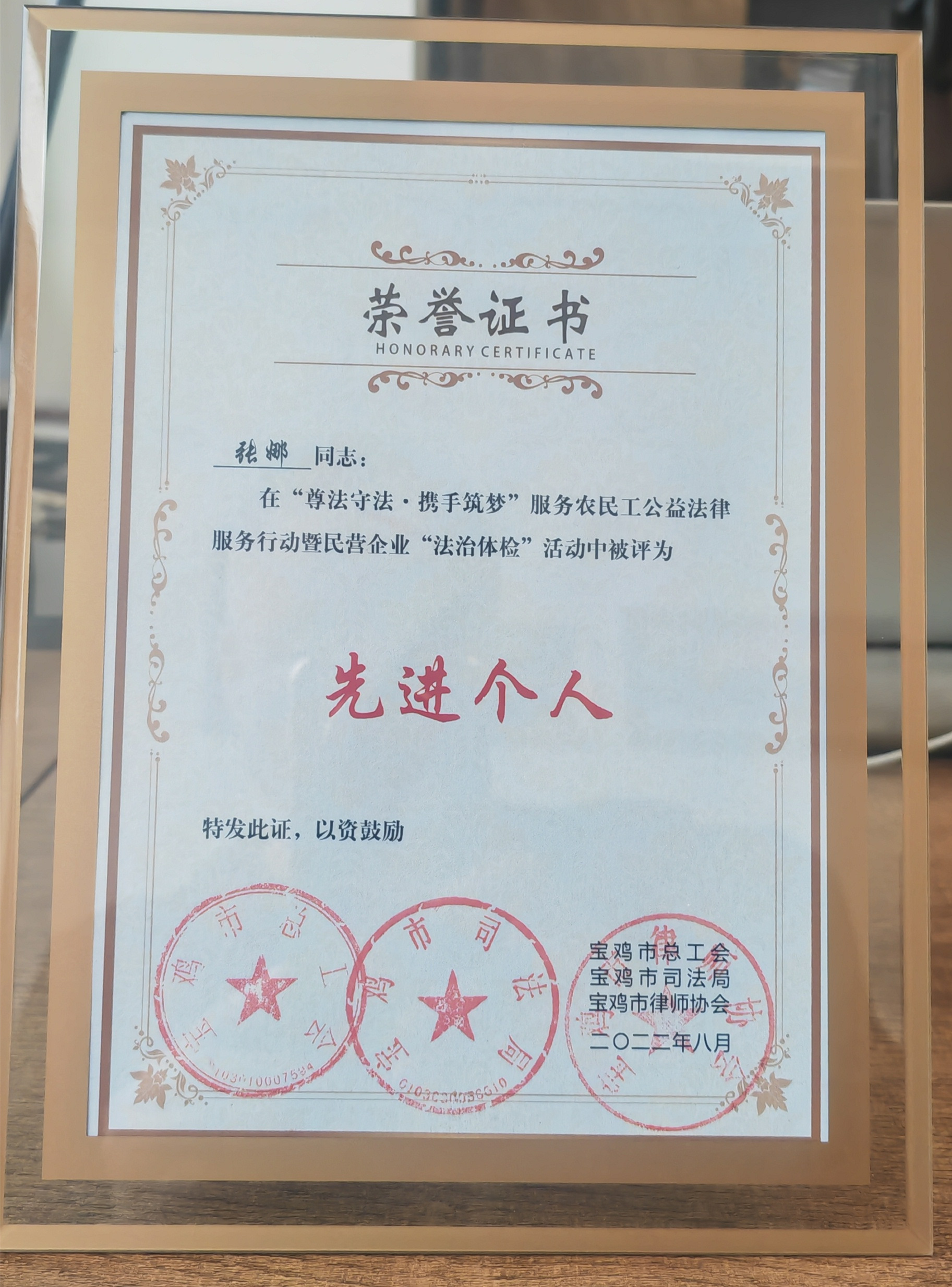 赛后,宝鸡市总工会、市司法局和市律师协会对“尊法守法•携手筑梦”服务农民工公益法律服务行动暨民营企业“法治体检”活动成绩突出的律师事务所和律师予以通报表扬。陕西行中律师事务所荣获“先进集体”,张娜律师荣获“先进个人”。