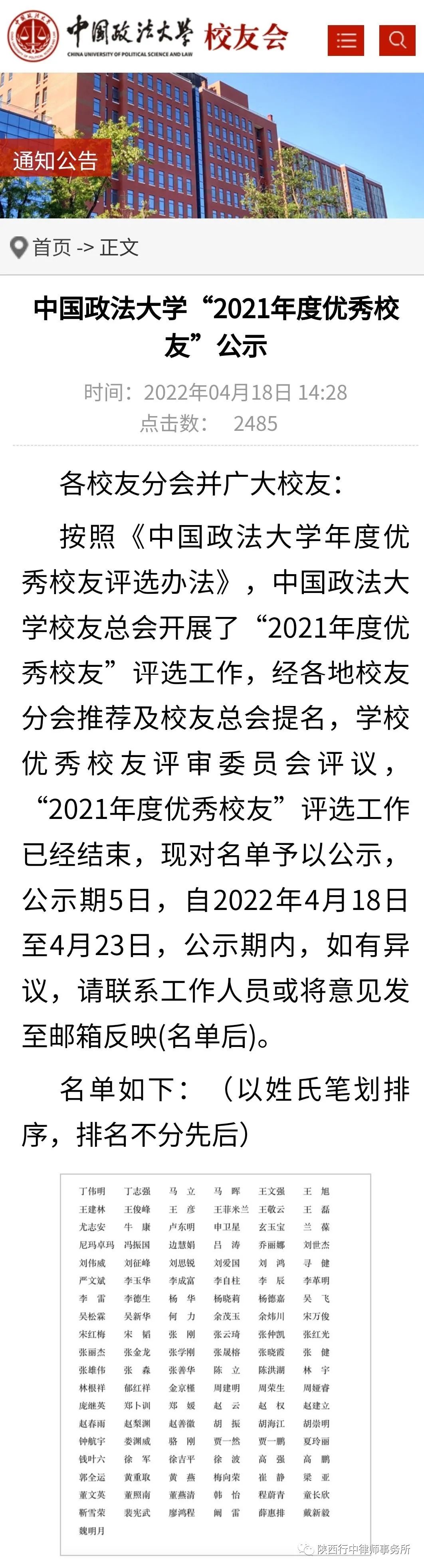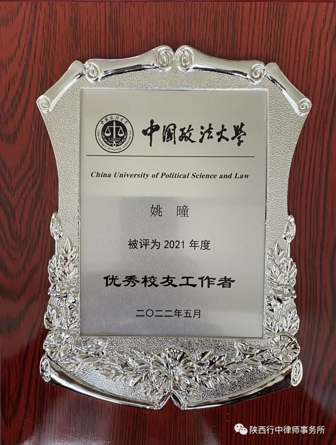 陕西行中律师事务所姚曈律师经陕西校友会推荐,被校友总会表彰为“2021年度优秀校友工作者”。姚曈律师在2011年在校期间成立陕西宝鸡校友会,常年担任宝鸡分会负责人,将宝鸡校友会从零发展至目前七十余人,每年保证多次举行活动,如新生入学、欢送毕业生以及过年团拜活动,受到了广大在校及毕业宝鸡校友的一致好评。2020年11月,在陕西省第二届理事会选任中,被评选任命为分会副秘书长。2022年被选任为分会秘书长,继续担任校友公益职位,开展校友公益工作。
