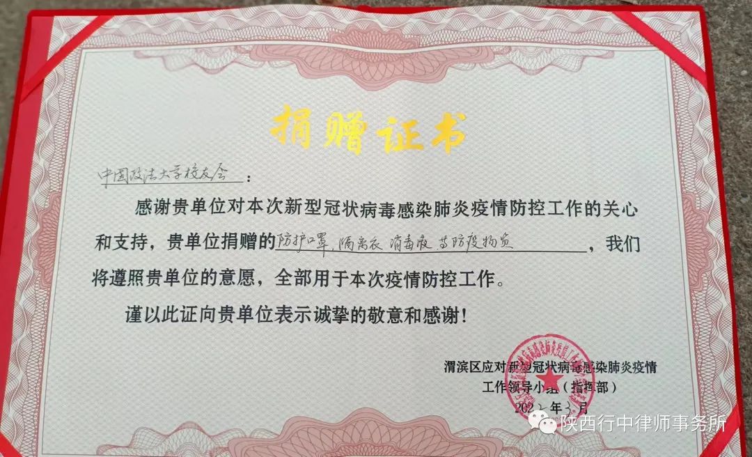 2022年3月8日,宝鸡突发新冠疫情。姚律师在按防控要求居家监测期间,时刻关注抗疫动态,想为抗疫工作贡献力量。当他看到每天都有大量医护人员和志愿者奋战一线,有些志愿者还缺少防护用品时,他立即向校友们发起募集抗疫物资的倡议,并与中国政法大学陕西校友会执行会长孔峰辉取得联系,以校友会名义开展募集活动。短时内,校友们便捐赠了医用N95防护口罩10200只、消毒液1020瓶、医用防护服120套。